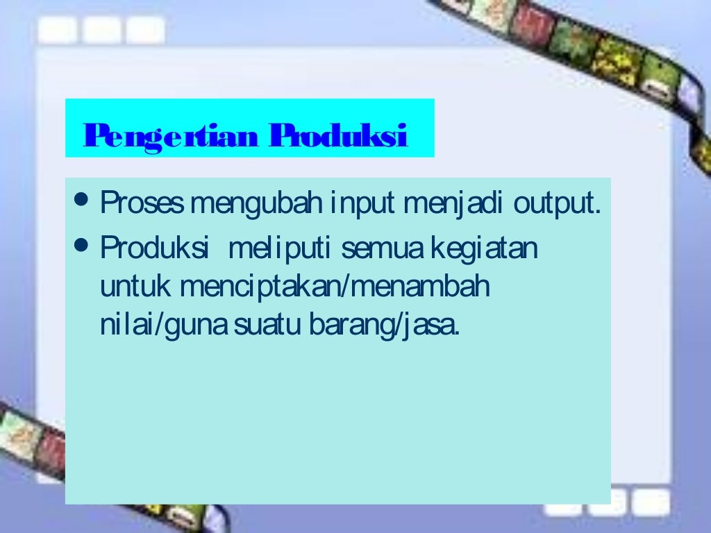 Produksi jangka panjang, adalah proses produksi tidak dapat diukur dengan waktu tertentu, misalnya 5 tahun, 15 tahun, 20 tahun dan. Dalam teori ekonomi, setiap proses. Teori produksi jangka pendek / satu faktor perubahan adalah teori produksi sederhana menggambarkan hubungan antara tingkat produksi item dengan jumlah pekerja yang digunakan untuk menghasilkan berbagai tingkat produksi barang. Teori produksi (dalam jangka pendek) _Part 1. Teori produksi teori produksi adalah teori yang menjelaskan hubungan antara tingkat.